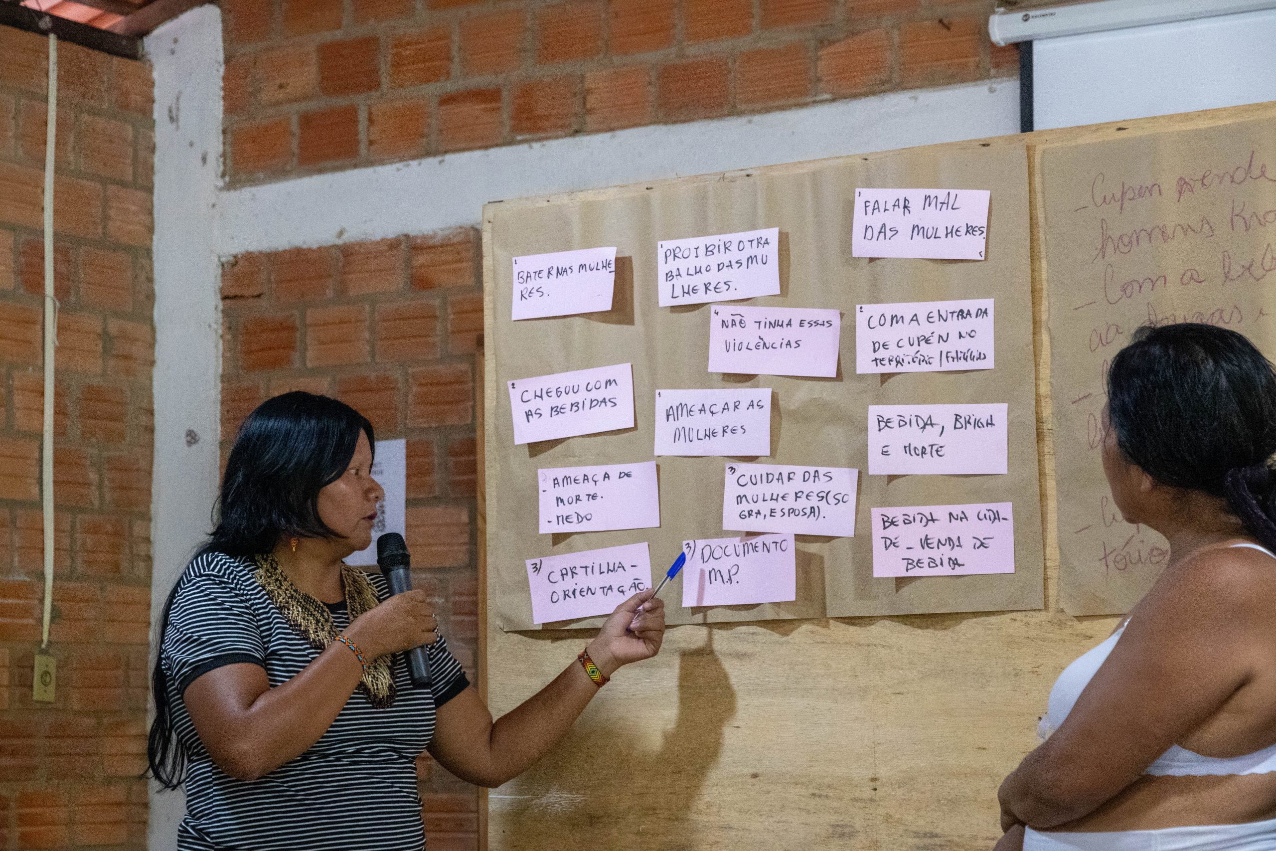 No segundo dia, as participantes refletiram sobre as diferentes fases da vida da mulher indígena e realizaram uma dinâmica sobre violência, debatendo coletivamente suas causas e formas de enfrentamento. Quatro grupos de trabalho apresentaram relatos sobre as violências nas aldeias, destacando o impacto do alcoolismo. Também foi apresentado o Dossiê das Mulheres Indígenas, seguido do anúncio da criação da Casa da Mulher Indígena, proposta pela Funai para acolhimento e apoio às vítimas de violência.
