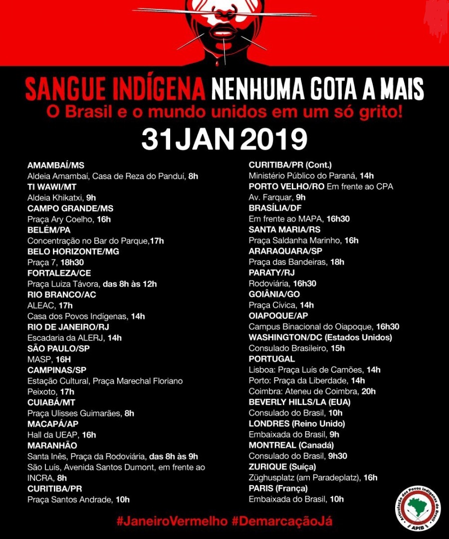 Nesta quinta-feira, 31, encerrando as atividades do #JaneiroVermelho – Sangue Indígena, Nenhuma Gota a Mais, os povos indígenas realizam uma série de ações em todo país com o objetivo de denunciar a crescente ameaça que os povos originários e seus territórios têm sofrido, bem como os retrocessos impostos pelo Estado brasileiro. Estão previstas ações em pelo menos 22 estados e no Distrito Federal, onde também será realizado a coletiva de imprensa, às 15h em frente ao Ministério da Agricultura, Pecuária e Abastecimento (MAPA). No exterior, também estão sendo organizados atos em pelo menos seis países, entre eles a Suíça, Inglaterra, Estados Unidos, Canadá, Portugal e Irlanda.